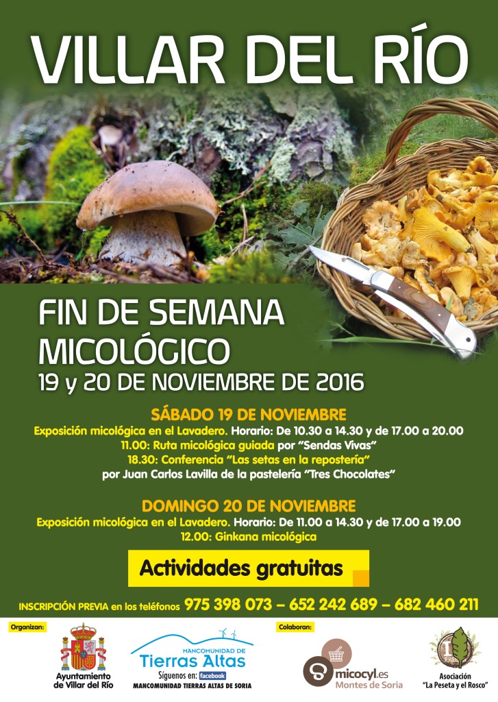 La localidad soriana de Villar del Río, ubicada en la comarca de Tierras Altas de Soria, organiza un fin de semana micológico los días 19 y 20 de noviembre, con el propósito de acercar a todo tipo de públicos el recurso micológico. Para ello ha programado diferentes actividades: Salida al campo guiada por especialistas de la empresa Sendas Vivas, una exposición y recreación del bosque en el lavadero del pueblo, una conferencia sobre "Las setas en la repostería" a cargo del afamado pastelero soriano Juan Carlos Lavilla (Pastelería Tres Chocolates) y una Ginkana Micológica para todo tipo de público (realizada por la empresa de educación ambiental Río Vivo).