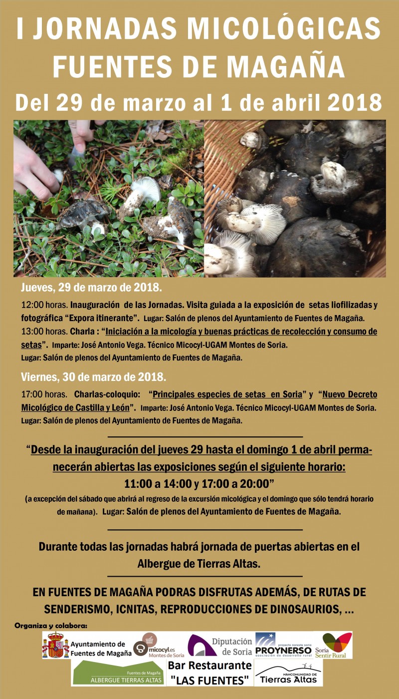 El Ayuntamiento de Fuentes de Magaña en colaboración con la UGAM Montes de Soria-Micocyl organizan la primera edición de estas jornadas micológicas en las que se podrá disfrutar de varias charlas sobre las principales especies de setas en la provincia de Soria, las buenas prácticas de consumo y recolección y una aproximación al nuevo Decreto de Micología de Castilla y León. También se podrá visitar dos exposiciones micológicas importantes y disfrutar de todo lo que ofrece a nivel de naturaleza y patrimonio el entorno de Fuentes de Magaña (rutas de senderismo, icnitas,…)