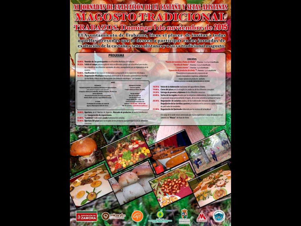 Disfruta el día 1 de Noviembre del tradicional Magosto en la localidad Zamorana de Trabazos. Podrás experimentar por medio de una ruta de campo, de los recursos que nos ofrece la naturaleza como son las setas, guiada con expertos en micología. Se hará posteriormente una clasificación de la setas recolectadas, y a las 14:30 horas degustación micológica en el restaurante "Los Castaños". Después de comer podrán dar un paseo por el mercado de productos de otoño transfronterizos.