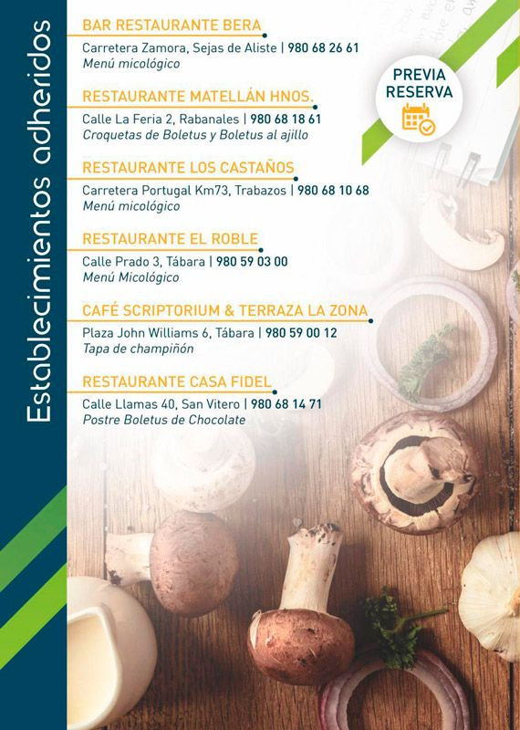 En Tábara, destacan el Restaurante El Roble, que sorprenderá a sus comensales con un Menú Micológico; el Café Scriptorium; Terraza La Zona, que ofrecerán deliciosas tapas de champiñón. Estos establecimientos se suman al Bar Restaurante Bera de Sejas de Aliste con su menú completo de setas, el Restaurante Matellán Hermanos de Rabanales de Aliste, que preparará Croquetas de Boletus y Boletus al ajillo, el Restaurante Los Castaños de Trabazos con otro Menú Micológico, y el Restaurante Casa Fidel de San Vitero, que deleitará con un original Postre Boletus de Chocolate.