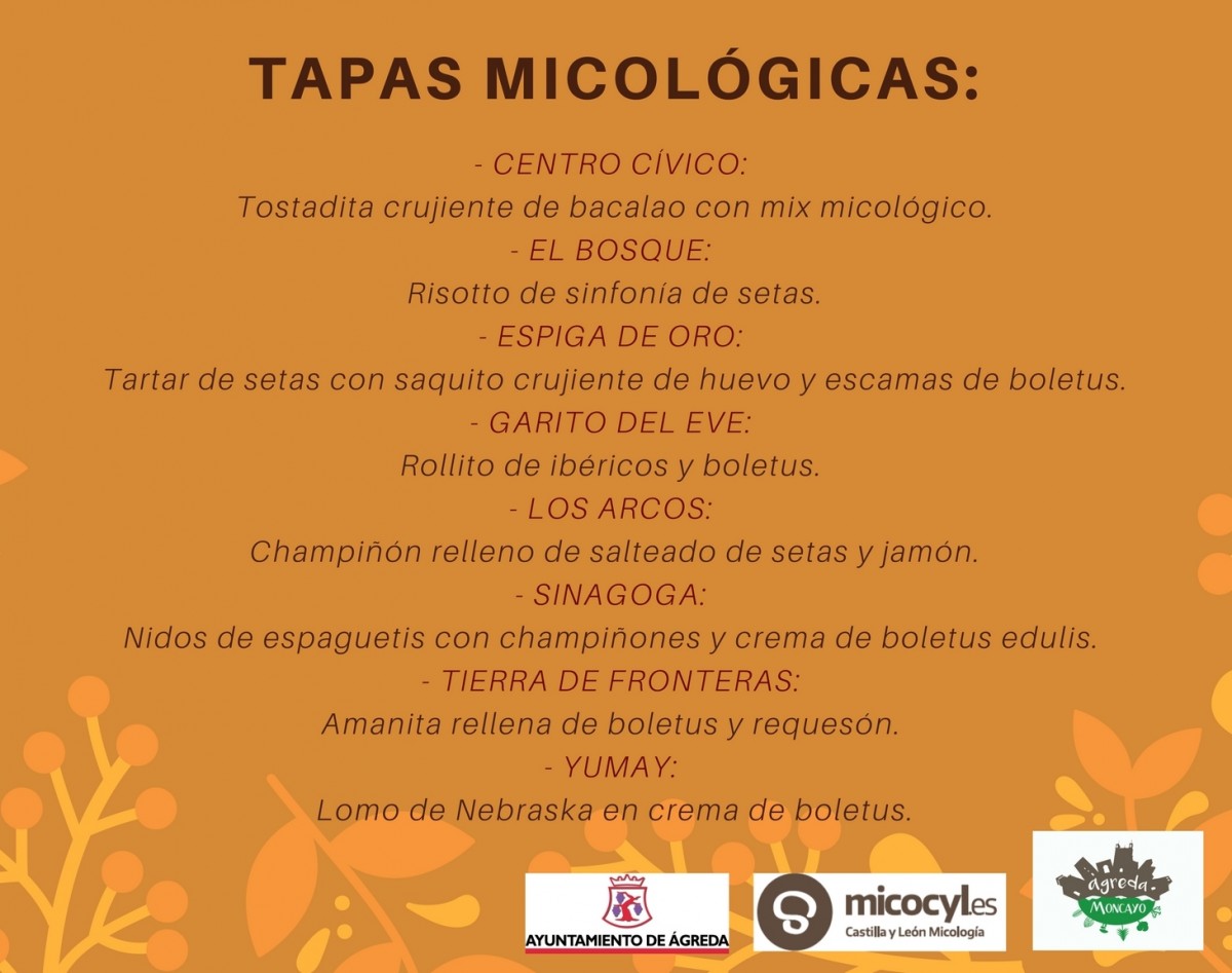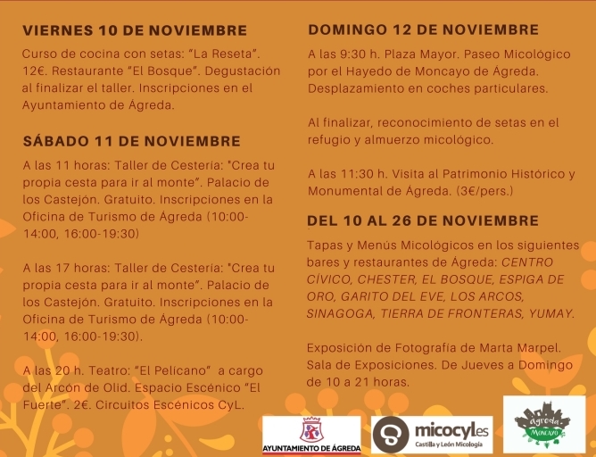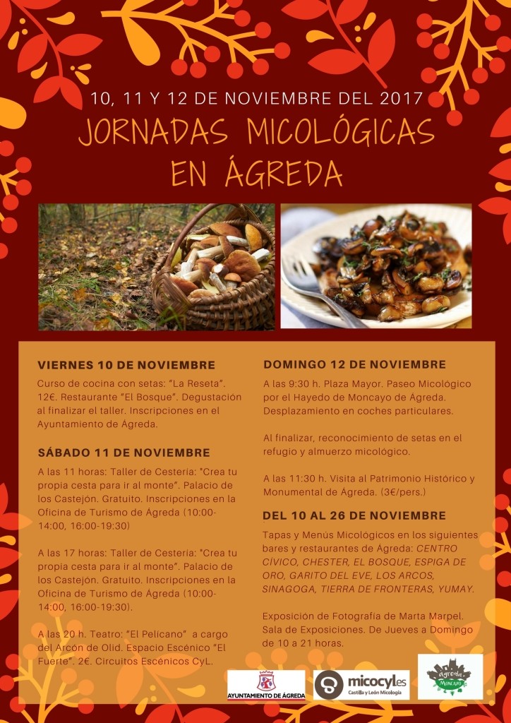 Talleres de cestería, excursiones, tapas, menús micológicos, teatro,... son algunas de las cosas que tienen preparadas el Ayuntamiento de Ágreda para este fin de semana micológico, dentro del programa de las Jornadas Micológicas de Ágreda. Organizadas en colaboración con la UGAM Montes de Soria-Micocyl dentro del acuerdo de promoción de las actividades de divulgación del recurso micológico en zonas reguladas de la provincia de Soria.