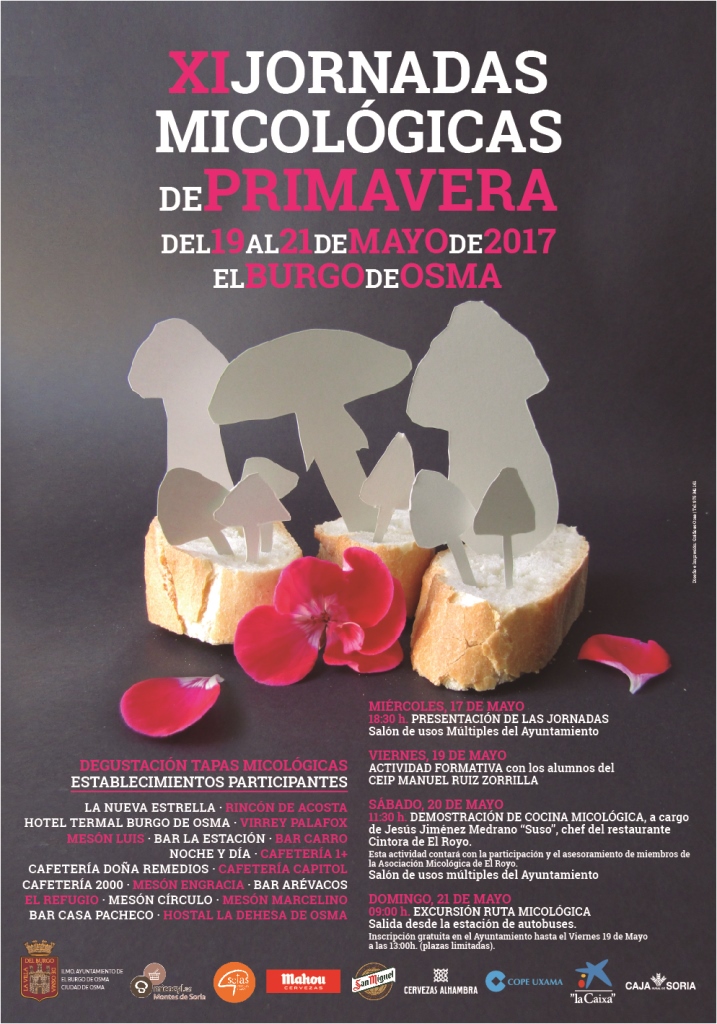 El Ayuntamiento de El Burgo de Osma organiza junto a Micocyl-UGAM Montes de Soria y la Marca de Garantía de Calidad Setas de Castilla y León las XI Jornadas Micológicas de Primavera durante los días 19, 20 y 21 de mayo de 2017. Dichas entidades han diseñado un programa completo de actividades en las que la gastronomía y el conocimiento de las setas de primavera serán protagonistas.
