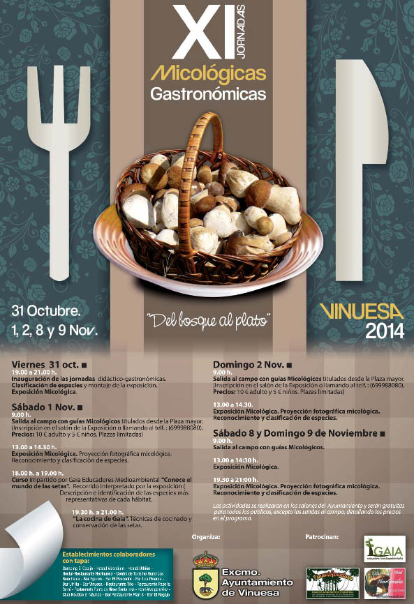 Vinuesa, en la comarca soriana de Pinares, celebra los días 31 de octubre, 1, 2, 8 y 9 de noviembre la XI edición de sus Jornadas Micológicas Gastronómicas, con salidas al campo, exposiciones, cursos de divulgación, de técnicas de cocinado y de conservación, entre otras.