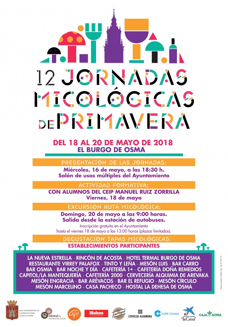 El ayuntamiento de El Burgo de Osma organiza nuevamente sus Jornadas Micológicas de Primavera, en colaboración con Micocy-UGAM Montes de Soria, los días 18, 19 y 20 de mayo de 2018. Es una cita muy consolidada en la provincia puesto que será su decimosegunda edición. Este año, además de la degustación de tapas en 21 establecimientos de la localidad, se realizarán actividades de educación ambiental con escolares y una ruta micológica guiada abierta al público (previa inscripción) por los montes de la zona.