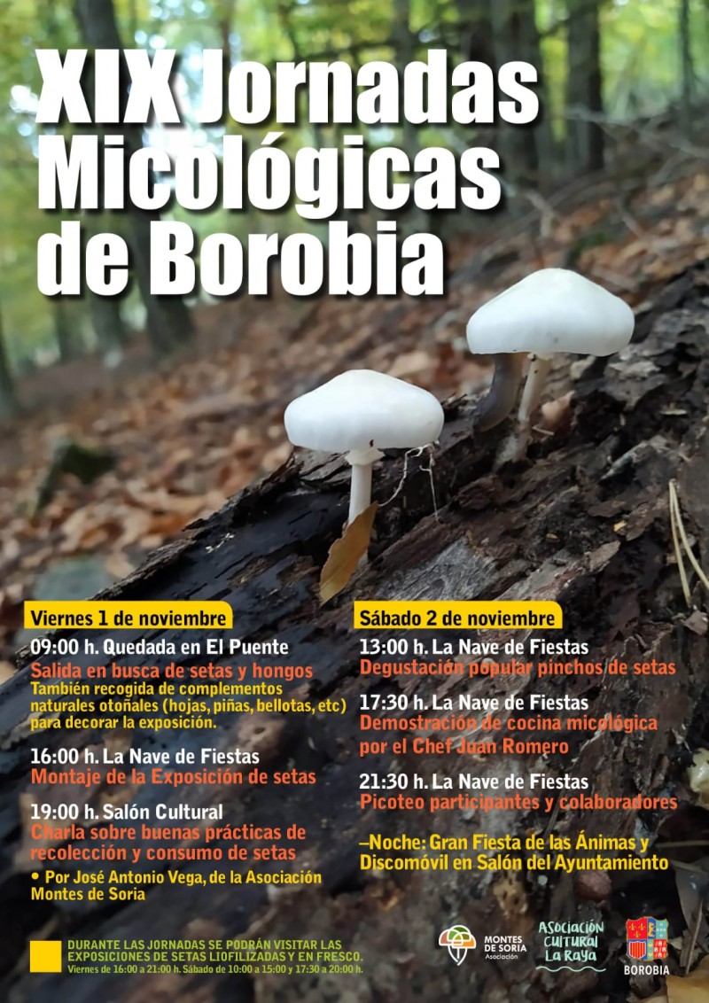 El Ayuntamiento de Borobia y la Asociación Montes de Soria organizan junto con la Asociación Cultural La Raya las XIX Jornadas Micológicas en las que se realizarán salidas al campo para buscar setas y motar la exposición en fresco, Degustaciones populares de pinchos micológicos, una charla sobre "buenas prácticas de recolección y consumo de setas" a cargo de José Antonio Vega, director técnico de la Asociación Montes de Soria y un taller demostrativo de cocina micológica a cargo del Chef Juan Romero. Todo ello se desarrollará en la nave de fiestas y el salón cultural del Ayuntamiento.
