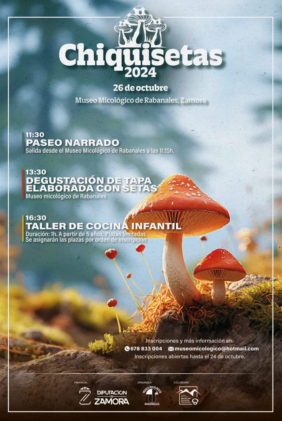 El sábado 26 de octubre de 2024, el Museo Micológico de Rabanales, en Zamora, celebrará `Chiquisetas´, una jornada dedicada a las setas con actividades para todas las edades donde se incluyen paseos, degustaciones y talleres infantiles. El evento comenzará a las 11:30 foras con un paseo narrado por los alrededores del museo, donde los asistentes podrán conocer más sobre el entorno natural de las setas.