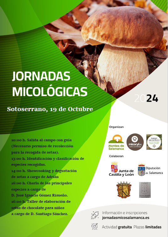 El sábado, 19 de octubre, el programa Micocyl, junto con la Asociación para el Desarrollo Sostenible de los Municipios de las Sierras de Francia, Béjar, Quilamas y El Rebollar, organiza unas Jornadas Micológicas en el municipio salmantino de Sotoserrano, perteneciente al Parque Micológico "Sierras de Francia, Béjar, Quilamas y El Rebollar".
