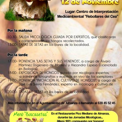 La localidad leonesa de Almanza organiza el 12 de noviembre la Segunda Edición de MicoAlmanza. El programa de actividaes incluye desde salidas guiadas por expertos micólogos, a charlas, exposiciones de setas en fresco y fotografía que tendrán lugar en el Centro de Interpretación Medioambiental "Rebollares del Cea". Durante el medio día y la tarde-noche, en los bares de la localidad se podrán degustar diferentes tapas micológicas.