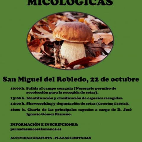 El sábado, 22 de octubre, el programa Micocyl, junto con la Asociación para el Desarrollo Sostenible de los Municipios de las Sierras de Francia, Béjar, Quilamas y El Rebollar, organiza unas Jornadas Micológicas en el municipio salmantino de San Miguel del Robledo, perteneciente al Parque Micológico "Sierras de Francia, Béjar, Quilamas y El Rebollar".
