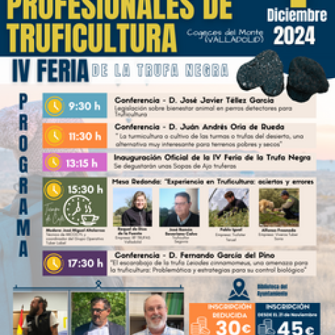 El domingo 1 de diciembre estará dedicado a las Jornadas Profesionales para Truficultores, que contarán con un completo programa de conferencias y mesas redondas sobre el sector de la truficultura. Entre los participantes destaca nuestro compañero José Miguel Altelarrea, experto en truficultura del equipo Micocyl, quien moderará la mesa redonda en la que truficultores de distintas regiones de España compartirán sus experiencias y conocimientos.