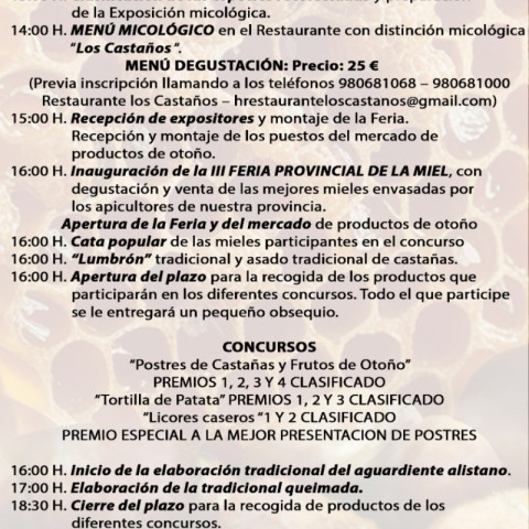 A las 14:00 horas, el Restaurante Los Castaños ofrecerá un exquisito menú micológico, elaborado con productos locales y protagonizado por las setas de la región. El precio del menú será de 25 euros (inscripción previa).