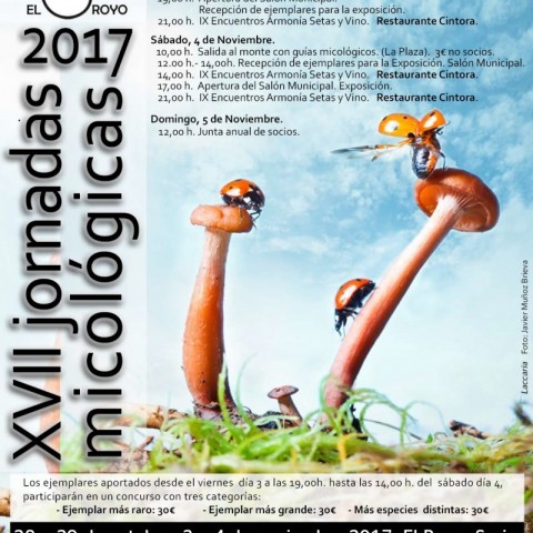 La Asociación Micológica El Royo (Soria) organiza sus XVII jornadas micológicas, para ello han programado diferentes e interesantes actividades que desarrollarán los días 28 de octubre, 3 y 4 de noviembre de 2017, todo ello en colaboración, entre otros, con el Ayuntamiento de la localidad y la UGAM Montes de Soria-Micocyl dentro de la inicitiva de apoyo técnico y económico a las entidades organizadoras de acciones de difusión y conocimiento de la micología en el área regulada de nuestra provincia.