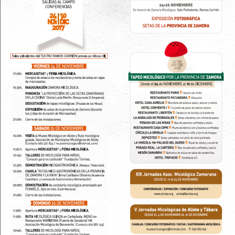Zamora Micológica arranca su edición de 2017 con un MERCASETAS y Feria Micológica en el teatro Ramos Carrión del viernes 24 al domingo 26, con degustaciones, charlas divulgativas, conciertos y actividades infantiles.