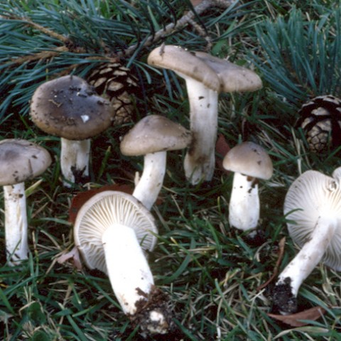Hygrophorus agathosmus Comestibilidad: Comestible. Sombrero: Convexo a plano-convexo, de 3-9 cm de diámetro. Cutícula: Lisa, muy viscosa, de color pardo-grisáceo a gris-oliváceo. Láminas: Decurrentes, espaciadas, céreas, blancas, con lamélulas. Pie: Cilíndrico, de 3-8*0,5-1,5 cm, blanco, furfuráceo en el ápice. Carne: Blanca, con fuerte olor de almendras amargas y sabor dulzón. Esporas: Elipsoidales, de 9-11*5-7 µm, hialinas, lisas, no amiloides. Esporada blanca. Hábitat: En bosques de coníferas. Hygrophorus latitabundus Comestibilidad: Buen comestible. Sombrero: Globoso, de 5-10 cm de diámetro, convexo, después extendido. Cutícula: De color gris-parduzco, viscosa y lisa. Láminas: Decurrentes, gruesas, espaciadas, de color blanco. Pie: Blanquecino, cubierto por restos mucilaginosos del color del sombrero. Carne: Blanca, densa. Esporas: Elipsoidales, hialinas lisas, de 8-14*6-7 µm. Esporada blanca. Hábitat: Pinares calcáreos.